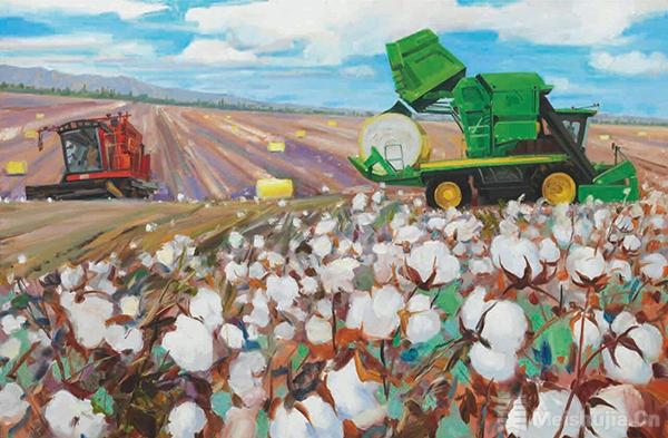 最典型的是《丰收棉田》。他用平视的角度画新疆的万亩棉田,没有按西方构成的思路,把棉田画成一片白,而是把白棉团、绿枝叶拆成一块块色块,像铺在地上的锦缎。画里一红一绿的采棉机,他没画得很大,却让它们成了“定海神针”。他就这么用油画的笔,写了东方的意,让不懂油画的新疆老乡能看懂“这画的是我们的地、我们的人”,也让懂艺术的人能读出“这是中国的油画,不是照搬西方的”。