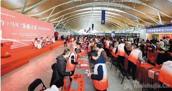 启动仪式后,书法家们同台挥毫,各展所长,或行笔稳健、行草洒脱,风格秀雅,笔墨间兼具传统韵味与新春喜气,他们一边悉心为旅客、市民书写春联与“福”字,一边耐心讲解内容、传递暖意。