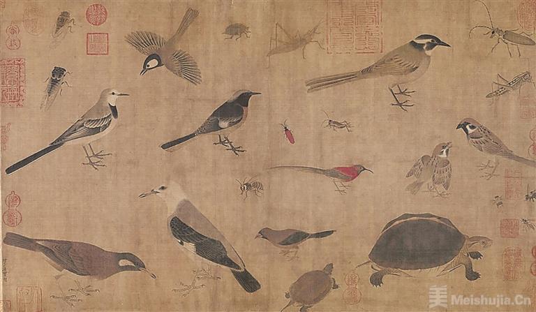 基于对“课徒稿”这一概念的不同理解,关于其产生的时代,目前学界存有多种观点。其中,“唐宋起源说”基于中国画教学功能的产生角度,关注中国画范本中具备课徒属性的画迹。如知名的《写生珍禽图》(图①),正是五代西蜀画家黄筌为其子习画所作。该作品精细描绘了各类禽鸟、昆虫等形象,其教学功能虽已显现,但并未出现有关习画之法的题款,总体上仍属于范画。而“明清起源说”则着眼于课徒稿这一形式的体系化形成。以董其昌与龚贤一脉为代表,画家从历代山水画中集合名家笔下风物,以画法步骤分解配合文字阐释,创作出明确以教学为目的的画稿,实现了“教习有法”。后人遂将龚贤的此类画稿编纂成册,如《龚半千授徒画稿》便是较为成熟的课徒稿合集。