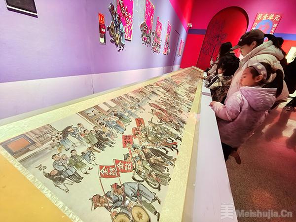 展览现场,一幅6米多长的国家一级文物《迎春图》格外引人注目。这件被誉为“蜀中《清明上河图》”的珍品,以绵竹县城为背景,全景记录了清代立春时节“迎春、报春、游春、打春”的盛大民俗活动,人物多达460余个,场景恢宏,展现了清代新春的热闹景象与民俗风情。