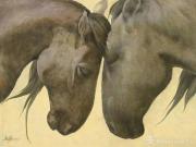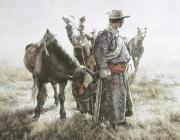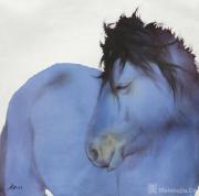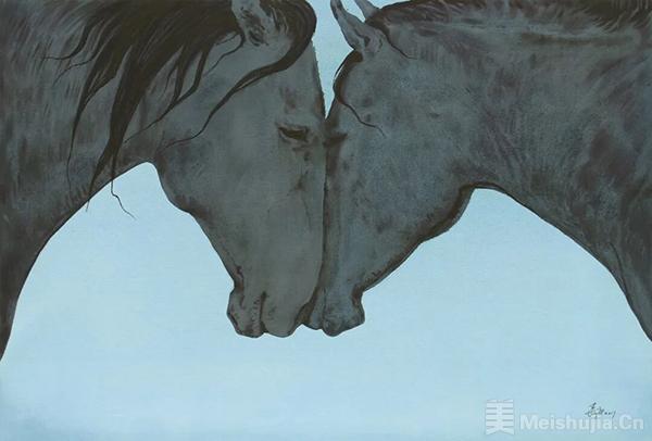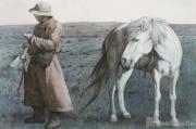 蒙古马自古以来就是牧人最忠实的伙伴,是民族精神的代表。在青少年时期,我也有一匹马儿,它是我最好的伙伴,陪我走过了一段有风雨也有阳光的岁月。它调皮、倔强却能干活,我舍不得让它驮过重的东西。每年3月,我都要前往离家1000多公里的大学读书,那时要坐一天一夜的“草原列”(连贯内蒙古东西的K274次草原列车)。因为学校离家很远,所以半年才能回一次家,可这匹马儿永远认得我,每次重聚还会发出悲愤的低鸣,似乎怪我怎么这么久不回家。这匹小马是我作品中所有蒙古马的精神贯通,我对这一题材的选择从来不是为了迎合风情画的趣味,而是草原生活给我的那种悠远的回忆和纯真的视觉感受。直到现在我还会经常想念我的那匹马,是我草原情结无法避开的一环。