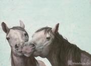 在草原上,蒙古马不仅是人赖以生存的工具,更是人的生活与精神的“共生者”。这种共存的姿态既存在于相互靠近之时,又存在于彼此独行之时。脱离人或人群的蒙古马,有着更为纯粹的、与草原自然互为依托的诗意。在2023年创作的《悄悄话》(图7)中,我用近景构图表现马儿与马儿之间令人动容的情感。例如,马儿的鬃毛随着低头的姿态柔和地飘荡在风中,为了表现这一情景,我通过大量的色彩晕染和叠加展现马儿的体积,加强了“真实筋骨”的感受,鬃毛的“线”元素和躯体的“面”元素形成灵动与沉稳的视觉张力,使马儿成为依托现实又超越现实的存在。低垂眼帘或轻闭眼睛的神态是对马儿放松、亲密情感氛围的捕捉,在画面组织碰撞的平面美感和写实造型力量的交织中,唤起观者对“情感羁绊”的思考或共鸣。因而,选择蒙古马作为近10年创作的主要题材,于我而言是对待生命与艺术最为直观也最为深厚的视觉经验。
