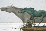 随着年岁的渐长,这种视觉经验有了更加丰富的表达,有时是鲜活的、在草原上奔腾的蒙古马,有时是陶制的蒙古马俑,我平日也会搜罗一些独特的小物件,除了蒙古马俑还有骆驼雕塑、小人雕塑及其他有趣的雕塑。这些体型虽小、看似寻常的小物件,却充满了草原的气质。我尝试把马俑身上细细的刻痕,骆驼背上的褶皱都用画笔画下来。当傍晚的阳光照进放置这些小物件的静物台时,我也会用画笔捕捉此时此刻的氛围。