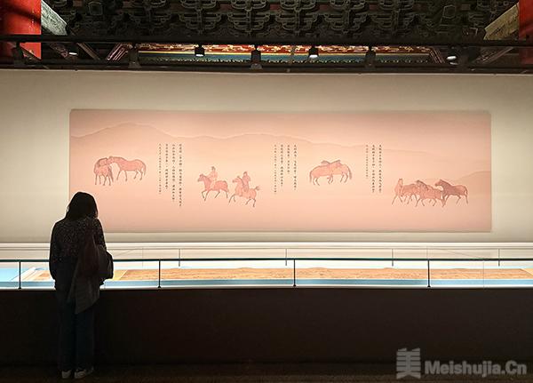 展览分为“行游”“牧放”“武功”“神骏”4个单元,展出55件与马相关的院藏珍贵书画,其中包括国家一级文物20件,首次展出文物28件。重点展品包括李公麟《摹韦偃牧放图》、赵霖《昭陵六骏图》、郎世宁《阚虎骝图》等历代画马名作。