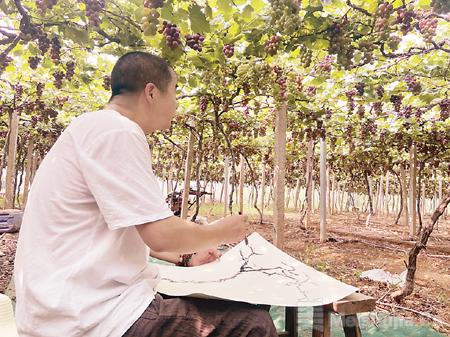 周金土现为浙江省美协会员、金华市教研室中职组美术大组长,任职于浦江县职业技术学校。近半年间,他深入田间地头,到浦江县各个葡萄基地采风、写生,创作了以“浦江葡萄”为主题的200多幅作品,精选其中100幅在横山村展出。“浦江葡萄全国出名,我作为一名本地艺术家,想通过书画的表现形式为‘三农’服务,所以我画葡萄,以艺助农,这也是服务我们县委县政府的中心工作。”谈及办画展的初衷,周金土如是说,“所有的作品我都是通过到现场去感受,现场写生而来,能在横山村展出,我觉得这个展览也是我一生中最接地气的展览”。