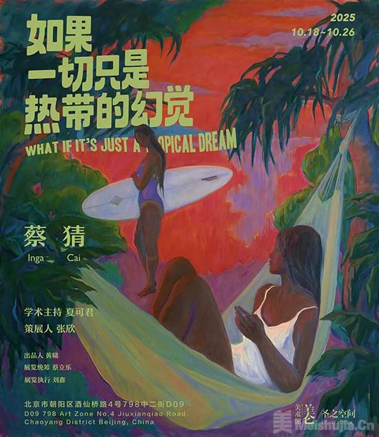 在蔡猜的笔下,“热带”从一个地理概念,变成了一种感官氛围。在《如果一切只是热带的幻觉》系列作品中,画面的色彩湿润而饱和,仿佛具有重量与温度,构筑出一个既真实又超验的领域。作为冲浪者的长期身体实践,使她将冲浪不仅视为运动,更是一种嵌入世界的方式。她与浪点社群——一个依潮汐节奏聚散的现代游牧部落——建立了深刻连接。画面中那些被阳光浸透的肌肤、涌动的海浪与转瞬即逝的相遇,让地点不再是固定坐标,而是由身体经验与情感构筑的、流动的栖居地。