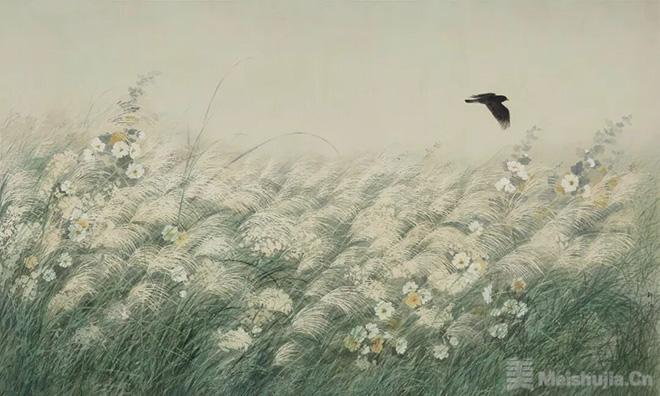 如今落笔:广漠天地下,蔓草铺陈,杂花遍野,看似幽寂的画面之下却涌动着难以抑制的蓬勃生机。唯有一只玄鸟正欲飞出画面……