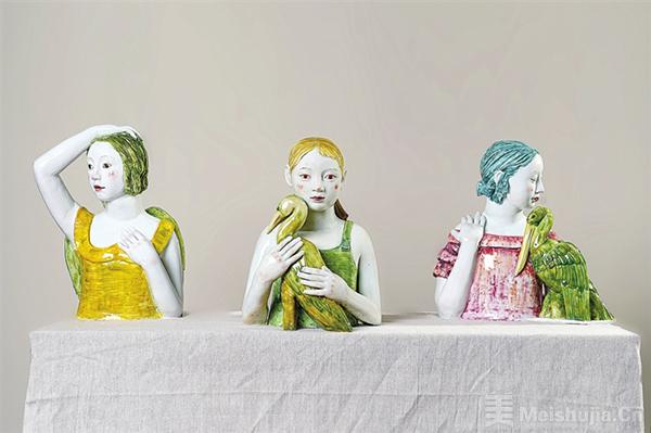 在作品《飞鸟系列》中,笔者一度在使用东方还是西方的造型语言中纠结。学院派写实人物的形体结构与陶瓷泥塑语言是冲突的,这迫使笔者花费大量时间调整形体结构的准确性。在作品《朝颜与夕颜》的创作过程中,笔者通过对比宋元陶瓷观音像与明清以后的陶瓷人物造像,找到了将中国传统造像与陶瓷釉色语言相结合的创作方式。