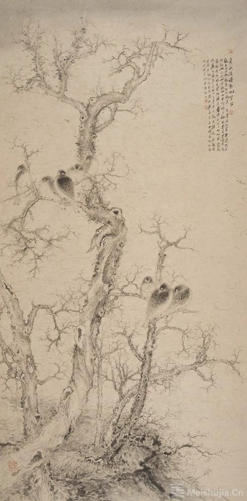 当今花鸟画家在画动物时,大多以物象造型精准、画的像为目的,这只是一种能力的表现,若在这一能力之上以笔墨造型为要,不画准、不画像,则是一种才情的体现。而刘万鸣在当今花鸟画家大多以画得准、画得像为基准的情况下,以自己独有的笔墨造型创造出多样的近乎拟人状的动物神态,这无疑已超越了这个时代的普世审美而成为独树一帜的艺术典范。有人说刘万鸣所画的动物是从古法中来,这只是一方面,其实,刘万鸣画中的动物造型更多的是他掌握了古法中造型的特殊规律,并从中创造出新的属于自己的造型法则和笔墨语言,这在他近些年所画的颇有神秘色彩的肖像素描中便可获得佐证,这一点,刘万鸣似乎已有别于古人。