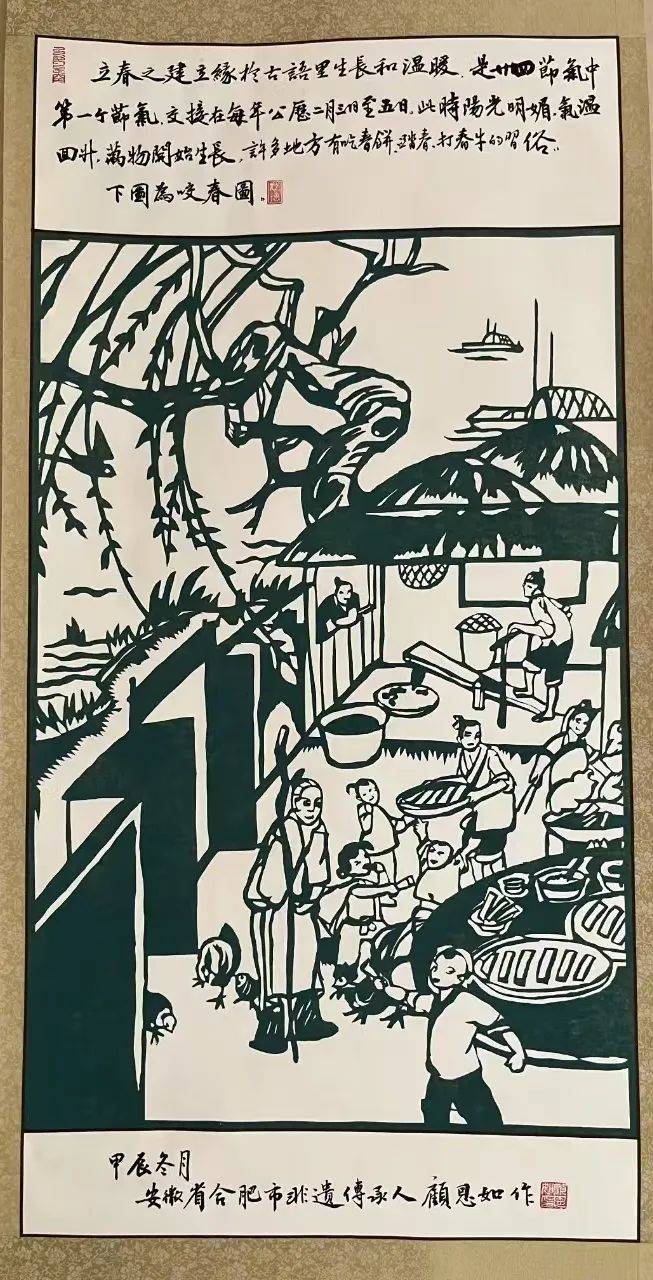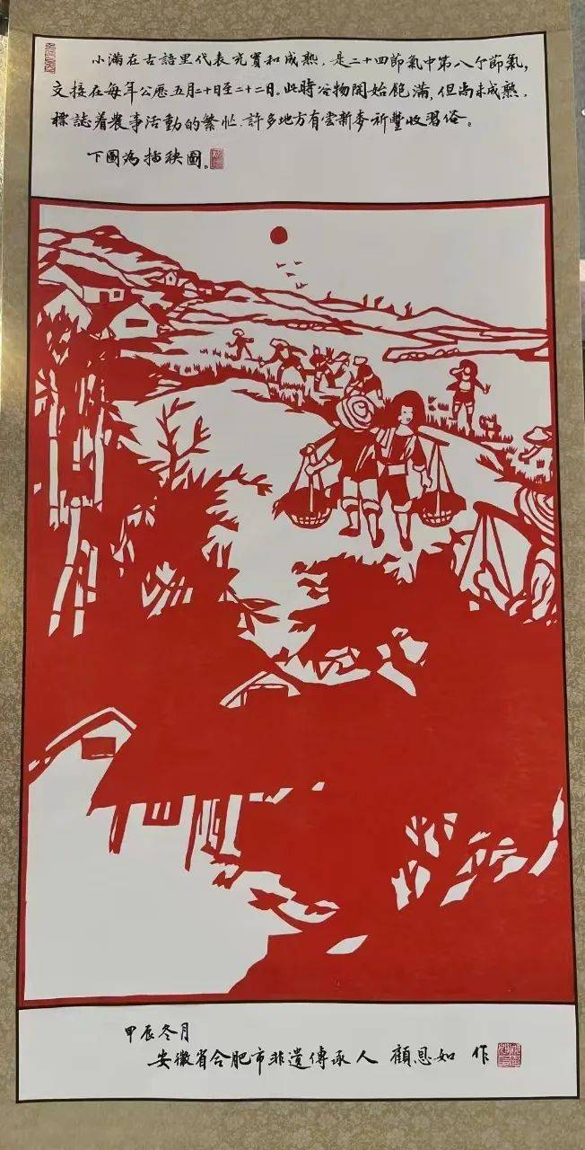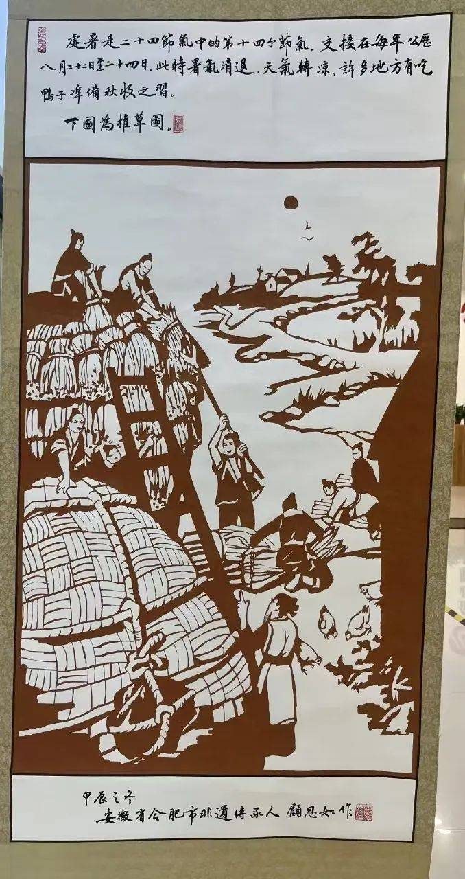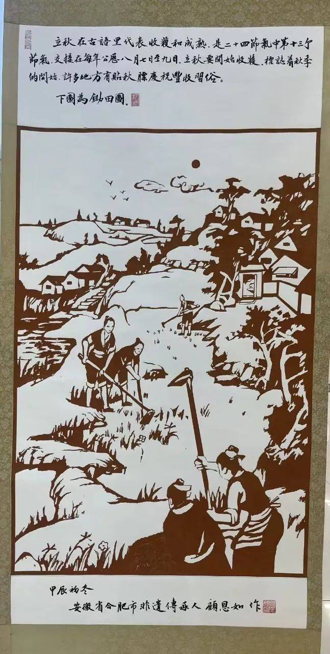 长丰剪纸代表性传承人顾恩如创作的“农耕文化里的24节气”剪纸作品。这套“农耕文化里的24节气”剪纸作品,主要融入了江淮流域的文化传承和元素,是一套非常完整的农耕文化里的二十四节气剪纸作品。作品节气分明,劳作明确,传统习俗浓郁。创作耗时两年,长约20米。