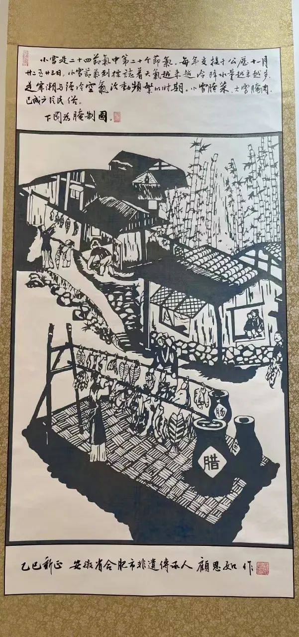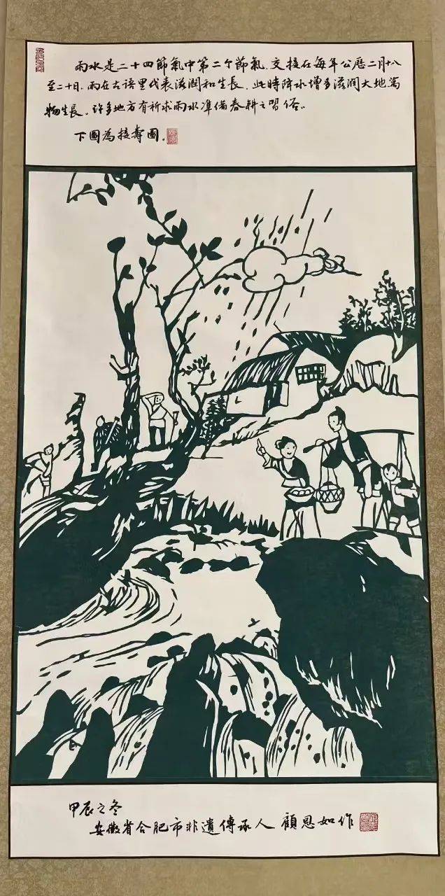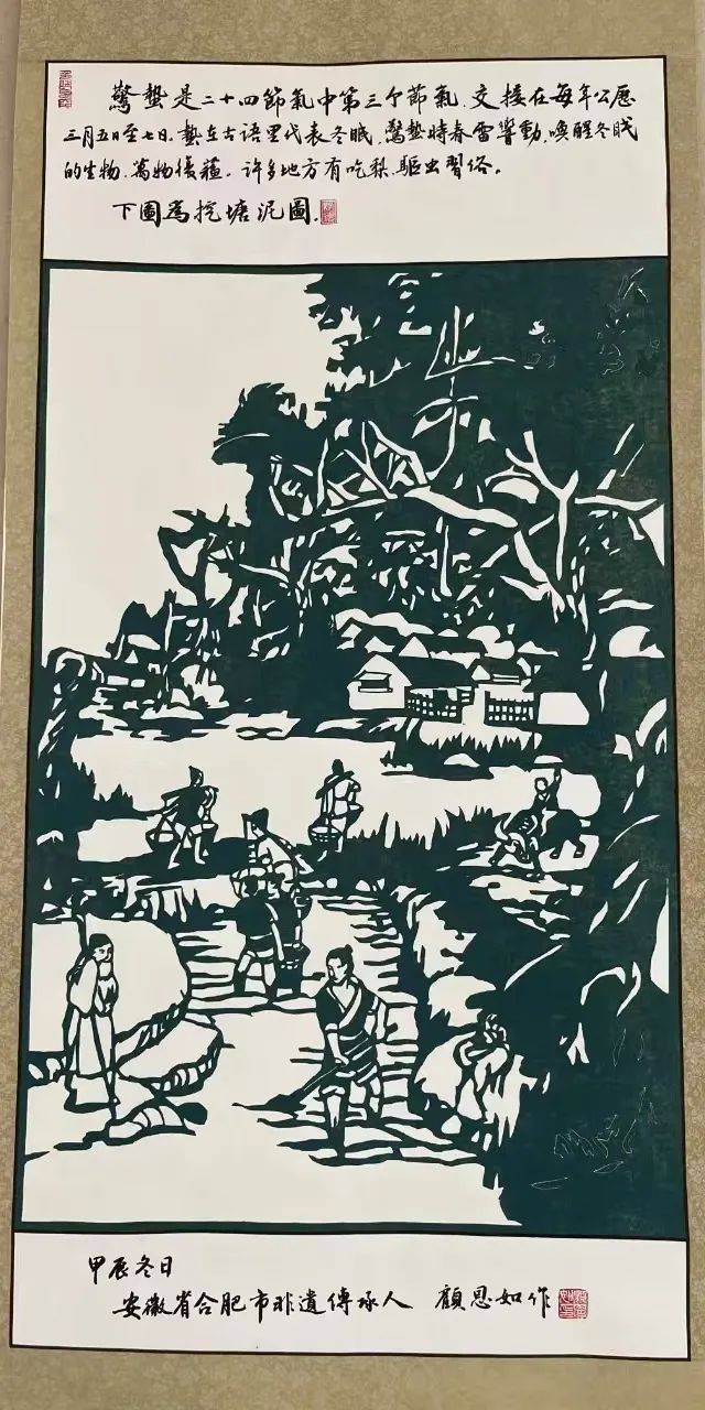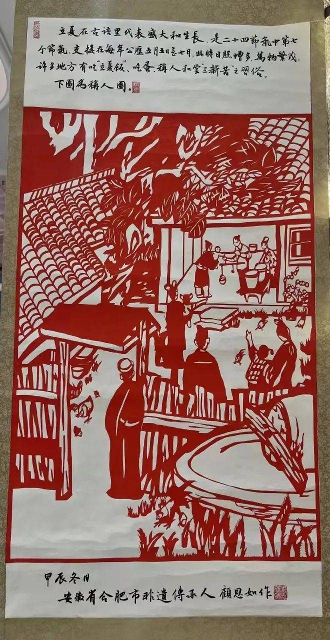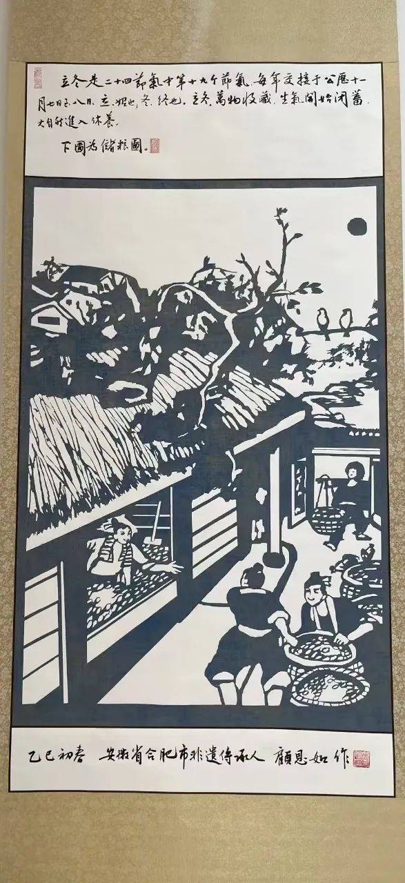长丰剪纸代表性传承人顾恩如创作的“农耕文化里的24节气”剪纸作品。这套“农耕文化里的24节气”剪纸作品,主要融入了江淮流域的文化传承和元素,是一套非常完整的农耕文化里的二十四节气剪纸作品。作品节气分明,劳作明确,传统习俗浓郁。创作耗时两年,长约20米。
