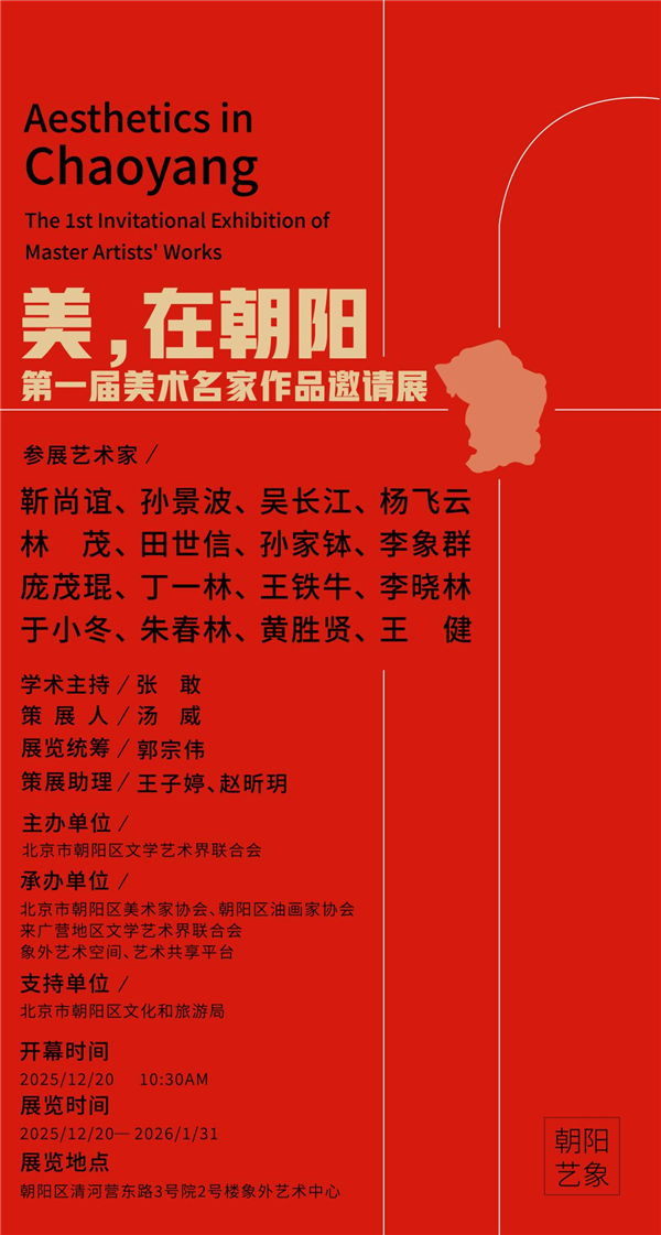 2025年12月20日上午10:30,由朝阳区文联主办,朝阳区文化和旅游局支持,朝阳区美术家协会、朝阳区油画家协会、来广营地区文联、象外艺术中心、艺术共享平台共同承办的“朝阳艺象丨美,在朝阳——第一届美术名家作品邀请展”在象外艺术中心盛大开幕。本次展览以“美,在朝阳”为核心主题,汇聚了靳尚谊、孙景波、吴长江等十六位国内顶尖美术名家的精品力作,以高水准的艺术呈现,为首都市民献上了一场兼具思想深度与审美价值的文化艺术盛宴。