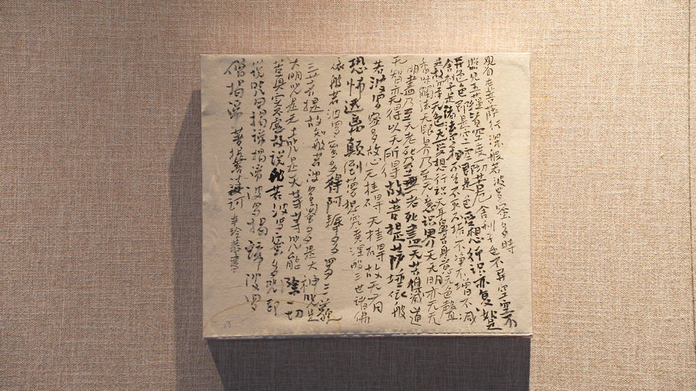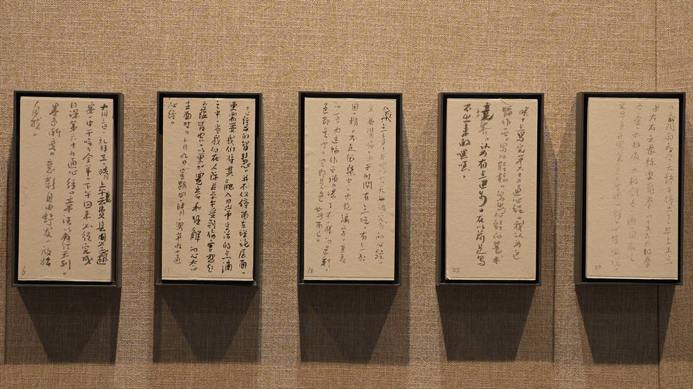 本次展览展出辛玲百余幅心经作品,呈现了一位书法修行者在技法与心境上的双重探索。其每幅心经所对应的“书写日记”是本次展览的最大看点,这批“书写日记”为打印纸材质,每张尺寸相当,随手记录了抄写心经时,当下的日期、天气、日程、自我尝试与心得等信息,集腋成裘,是为“辛经”。曾翔老师对此评价道:“辛经清爽,是自然流露。”