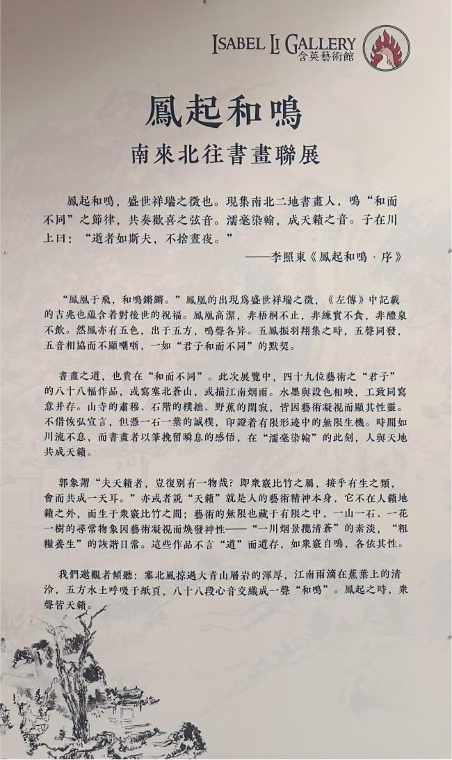 “凤起和鸣——南来北往书画联展”汕头展区实景 凤起和鸣,盛世祥瑞之征也。现集南北二地书画人,鸣“和而不同”之节律,共奏欢喜之弦音。濡毫染翰,成天籁之音。子在川上曰:“逝者如斯夫,不舍昼夜。” ——李照东《凤起和鸣·序》