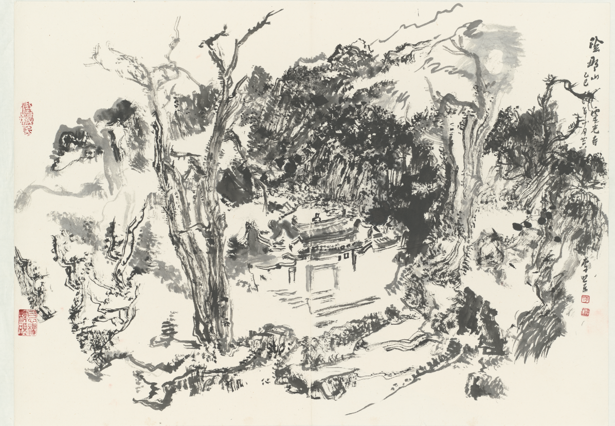 李照东:《阴那山灵光寺》 50cm×70cm 2025年 画作采用“深远法”构图,描绘的是“广东四大名刹”之一的广东梅州阴那山灵光寺。前景中灵光寺的山门和门前挺立两棵古柏映入眼帘,它们一荣一枯,一生一死,生者枝繁叶茂,死者枯而不朽,被称为“生死树”。而在大山的映衬下,寺门后的大殿若隐若现——“曲径通幽处,禅房花木深”。 郭象谓“夫天籁者,岂复别有一物哉?即众窍比竹之属,接乎有生之类,会而共成一天耳。”亦或者说,“天籁”就是人的艺术精神本身,它不在人籁地籁之外,而生于众窍比竹之间;艺术的无限也藏于有限之中,一山一石、一花一树的寻常物象因艺术凝视而焕发神性——“一川烟景揽清苍”的素淡,“粗粮养生”的诙谐日常。这些作品不言“道”而道存,如众窍自鸣,各依其性。