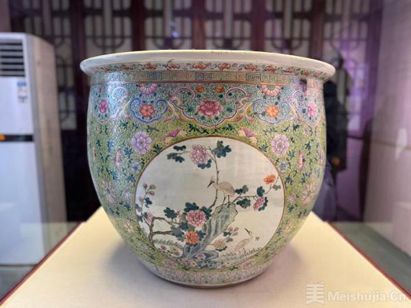 “清绿地粉彩开光花鸟纹鱼缸”10日亮相沈阳故宫敬典阁“院藏珍宝展”。