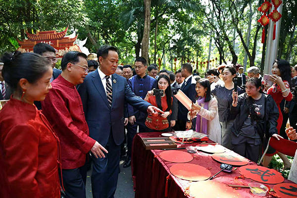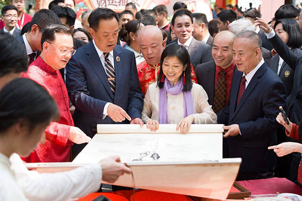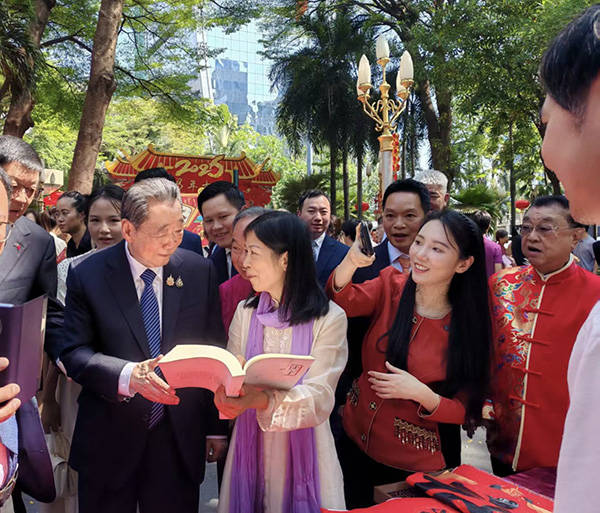中国侨商联合会会长、正大集团资深董事长谢国民也十分喜爱中国书法与传统文化,对谢飞东、聂晖合著的书法文字学专著《读字》一书深表兴趣,对嵌入谢家子弟如“芝兰玉树”的赠语“春风玉树诗书第,瑞日芝兰德福家”也频频颔首。