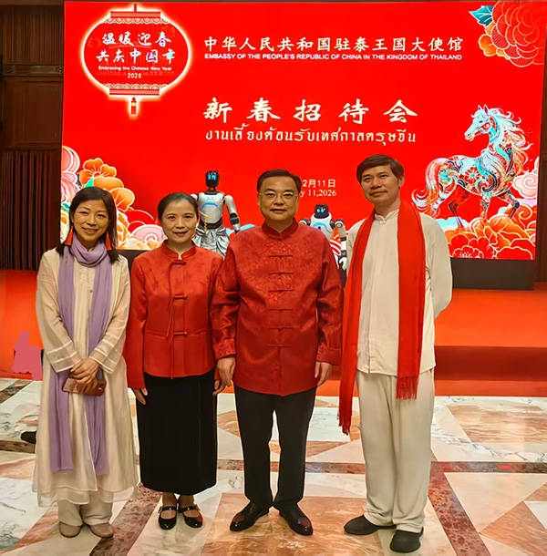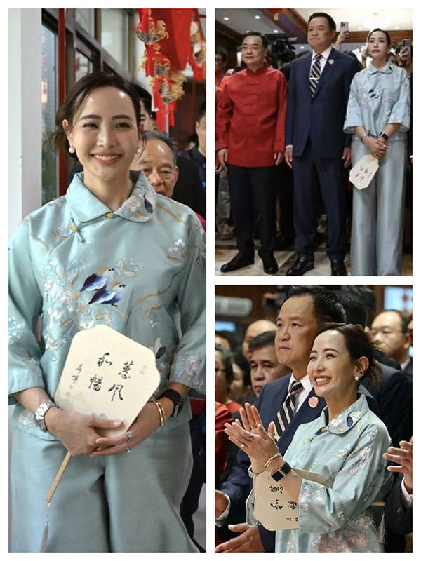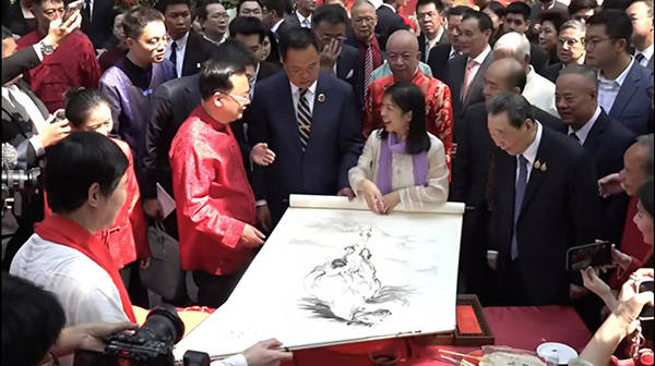 在书画展示区,知名书画家聂晖向前来出席招待会的泰国总理阿努廷赠送了《天马驰原》图,画作中一匹骏马驰骋于草原之上,灵动传神,契合马年新春主题,其上小楷书谢飞东先生七律诗作。阿努廷十分喜爱,兴致勃勃地找纸写下了自己的中文名陈锡尧,并邀请书法家将他的中文姓名题于《天马驰原》画作上,让这幅画作成为中泰友好互动的生动见证,也为这份新春情谊留下了文化与艺术的特别纪念。