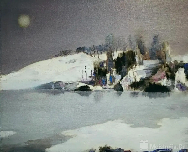 随着创作的深入,王洪彬的视野不断拓宽,作品逐渐跳出单一的题材束缚,融入个人情怀与对社会的深刻观察,兼具诗意与温度。《冬湖》便是其诗意油画的代表作,画面中朦胧的意境、灰调的色彩与优雅的质感,将江南水乡的静谧与悠远展现得淋漓尽致,悠悠的画面氛围直抵人心,让观者在光影流转间,触摸到那份藏在朦胧里的诗意与柔情。《融雪》承载着厚重的革命情怀,军人形象与辽阔天地相融共生。三个人物刻画凝练深刻,将革命理想的崇高、信念的坚定,尽数融入皑皑苍茫之间。画面色彩沉稳却蕴藏磅礴力量,悠远意境是对革命理想的深情赞颂,尽显画家对画面的出色掌控力与情感的精准表达。