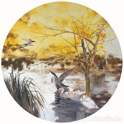 青头潜鸭又飞回来了(油画)张广军作