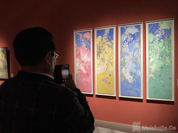 走进展厅,首先映入眼帘的就是参展艺术家、中国国家画院原院长卢禹舜带来的多件大尺幅作品。在《天地大美 心驰神往 笔遂墨顺》中,浩瀚无垠的天幕倾泻而下,为整个画面笼罩上了一层神秘而幽静的色彩,天地洪荒、悠远宁静的大美扑面而来。