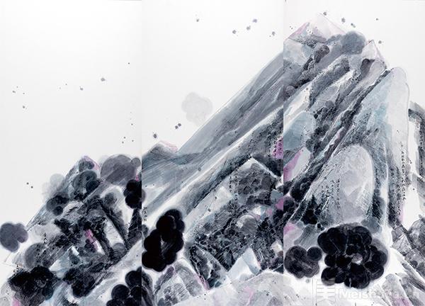 “图”的形式焕新可以激活“辞”的能量。徐勇民的《草木莽莽》选用了柔韧的生宣并施以暗含草木形色丰富变化的玫瑰色调,借锐利的山形轮廓勾勒,描绘出生机盎然的景致。作品以大块的瑰丽色彩反复琢磨刻画,与传统水墨画表现形式形成强烈对比,力图突破水墨画的表现边界。薛松的《岸边行吟图》运用拼贴重组,将历史记忆与当下现实、传统文化与现代观点连接起来,具有独特的视觉效果和文化内涵。方少华的《无谱之竹》系列作品以极具个人化的视觉方式,阐释了对历史文化的理解——覆盖与遗忘。作品融合了东方艺术的书写性与西方油画的厚重质感,在色彩交织的压迫与灵动间,传达出对信息时代的文化困惑、传统与当代的互动等命题的思考。